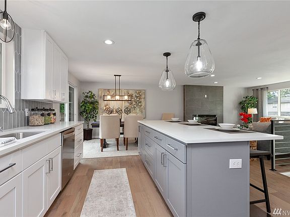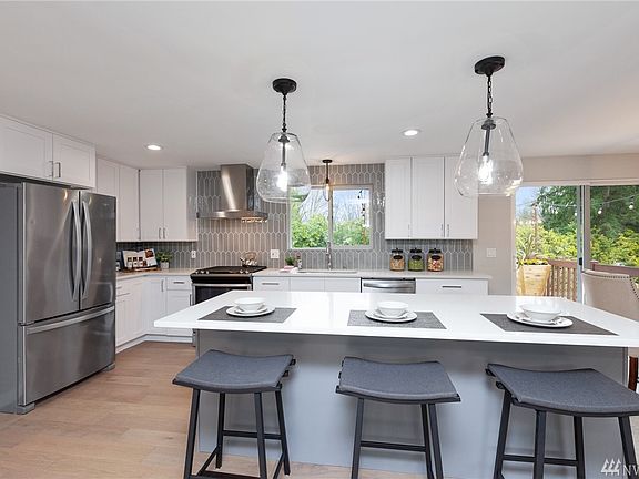 Welcome to this bright, beautifully remodeled open concept home minutes from shops, schools & Burke Gilman Trail. Spacious entry w/ floor to ceiling windows for added light through living room & kitchen. Striking 8' island with artisan lighting is the perfect hub for entertaining. Large backyard w/ deck off dining room, extensive hardwood floors, custom fireplace & modern finishes throughout. Master bed w/ en suite bath & stylish barn door. 2 car garage w/ shop, storage & fridge. Move right in!