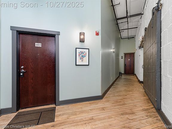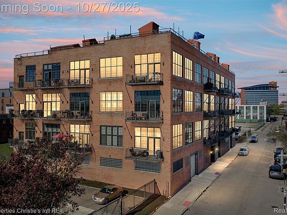 A Corktown Masterpiece: Where Historic Charm Meets Modern Loft with Epic City Views. Discover your urban sanctuary in the heart of historic Corktown. This exceptional condo seamlessly blends industrial character with contemporary elegance. From the moment you enter, you are greeted by an awe-inspiring open-concept living space defined by its soaring 14-foot ceilings, original exposed brick, metal stairs and railings, and rustic wooden beams. Sunlight pours through magnificent 9-foot windows, illuminating the rich hardwood floors and highlighting the lofted second level that has room for a bedroom and flex lounge space equipped with bar sink and cabinet. This thoughtfully designed home features a rare and highly sought-after layout: two spacious areas for bedrooms, each boasting the privacy and convenience of a full en-suite bathroom. An additional half bath is perfectly placed for guests. The true showstopper, however, is the unparalleled access to the city's iconic skyline. Enjoy your morning coffee on the private balcony off the main living area, or entertain guests on your exclusive individual rooftop deck. From this incredible vantage point, you'll witness unobstructed, panoramic views stretching from the majestic Michigan Central station to the glittering downtown Detroit skyline, and across the river to both the iconic Ambassador Bridge and the new Gordie Howe International Bridge. This is more than a home; it's a front-row seat to the renaissance of a great American city.