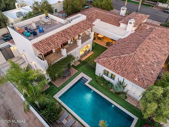 In the heart of Sam Hughes, this rare 2015 Seaver Franks-designed masonry home (remodeled 2021) blends historic charm with modern scale. The main residence offers a phenomenal great room, 4 bedrooms, 4 baths, a large wood paneled office, and an oversized 3-car garage. A private guest house includes a bedroom, bath, living room, and kitchenette. Resort-style backyard with pool, mature citrus, and expansive roof deck with panoramic city and mountain views. Interiors feature curated finishes, in-floor radiant heating, soaring ceilings and seamless flow. Additional highlights: all new HVAC (2025), hardwired ethernet, and whole-home audio. An extraordinary opportunity in Tucson's most coveted historic neighborhood. Owner is a licensed agent in the state of Arizona.