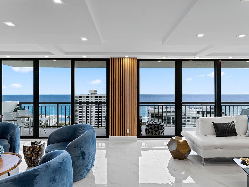 An extraordinary opportunity to own a meticulously reimagined penthouse, seamlessly blending modern elegance with breathtaking oceanfront and Intracoastal views. Designed for both style and functionality, the open-concept living space was thoughtfully transformed from a three-bedroom into a more expansive two-bedroom layout--yet remains a flexible, transitory space, easily adaptable to suit various lifestyles.Bathed in natural light, this residence boasts a wraparound terrace, custom wood-paneled walls, striking tiled columns, and designer finishes that exude a refined Miami-inspired aesthetic. A brand-new chef's kitchen showcases top-tier Bertazzoni & Miele appliances, a built-in coffee station, and a dramatic leathered black diamond quartzite island. Adjacent, the dining area features a sleek custom wine wall, perfect for entertaining. The primary suite is a sanctuary of luxury, enhanced by a sliding wood barn door, while spa-like bathrooms feature floor-to-ceiling tile and premium fixtures.