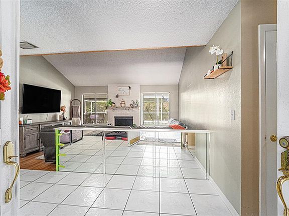 Large enclosed in-ground poolVaulted ceilingsBrick fireplace
