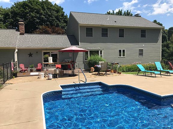 You'll fall in love with this charming & spacious colonial home on 2 acre lot one mile from Exit 13! In addition to its incredibly convenient location, this property boasts an entertainer's backyard, complete with in-ground pool, fenced yard, deck & fire pit. Inside, take in the charm & delight of an open floor plan defined by beautiful columns & trim work. The kitchen is huge w/granite counters, tile backsplash, stainless appliances & breakfast bar. There are both family and living rooms with brick fireplaces. Hardwood floors can be found on both 1st and 2nd floors. The master bath has recently been upgraded with GORGEOUS marble tiled flooring & shower, complete w/modern double sink vanity. Other amenities include mud room w/built ins, 1st fl laundry & finished bonus space in basement.