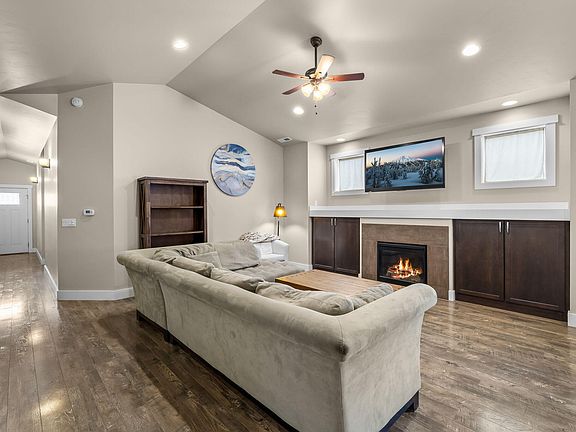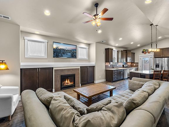 Welcome home to this beautiful professionally landscaped single level home with an open floor plan located near Bend's popular Old Mill District. A cozy front porch greets you before entering a wide entry hall to the super spacious vaulted great room. Hardwood floors run throughout the living spaces and compliment the tile surround gas fireplace with adjacent built in cabinets. Entertainers and chefs will love the immense kitchen island, lengthy counters and the abundant cabinets! A kitchen door leads to the back covered patio and fenced in grassy yard. The roomy primary suite has a ceiling fan, walk in closet and a bathroom with two sinks, tile counters, and tile surround shower. There are an additional 3 bedrooms, one of which can also serve as a den or office and has glass French doors! An alley entry garage has plenty of space and enters the mud room with sink, cabinets and a closet. The alley terminates at this property offering a little more privacy and less traffic!