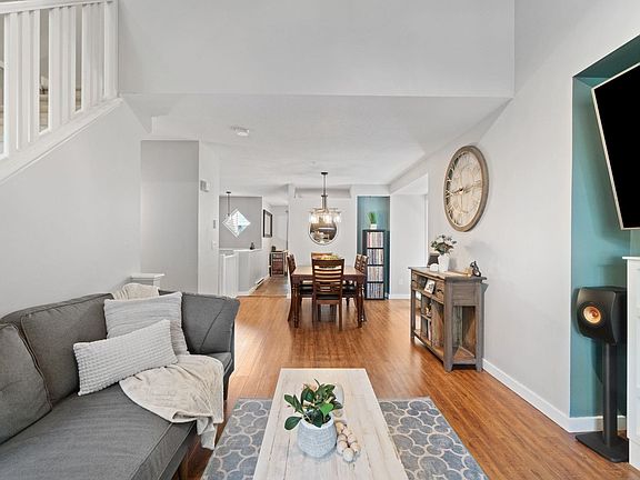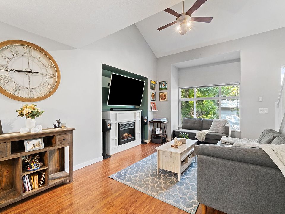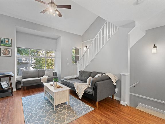 Welcome to DENIM II! Located in the heart of Willoughby, this bright end-unit townhome is within walking distance to all amenities. Enjoy the vaulted ceiling in the living room. The kitchen offers a large island with breakfast bar and access to a sunny south-facing balcony, perfect for BBQs. Upstairs features a spacious primary with a walk-in closet and a 4-piece bath, plus a generous second bedroom. The lower level opens to your private, upgraded backyard with a gazebo and new fencing, ideal for kids, pets, or entertaining. Updates include a new garage door motor, microwave and washer, making this home move-in ready. With a tandem garage, kid and pet friendly complex with playground, basketball court, and clubhouse—just minutes to parks, schools, transit, and HWY #1! Open House Sun 11-1pm
