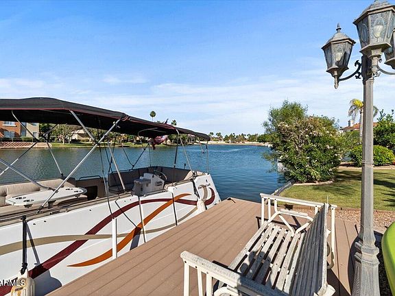 Custom waterfront home on the Regatta Lake. Beautiful property on one of the largest lots in gated Val Vista Lakes subdivision. 4 -car garage with a large driveway in a cul-de-sac makes this a one-of-a kind ! Huge backyard with recent updates that include a pergola, outdoor kitchen, bar and travertine pavers. This backyard has plenty of space to run and a dock for parking your private boat. Heated pool and spa, outdoor firepit make this a sanctuary in the desert. Large kitchen open to the family room with dinette, walk in pantry and island. Formal dining & living room.. Main level has en-suite bedroom perfect for guests or MIL set-up.. Downstairs bar has built-in ice maker across from a huge laundry room. Upstairs you find a an amazing primary bedroom with sitting room and large spa-like master bathroom with separate spa and shower.. You will LOVE this large walk-in closet with natural light. Two secondary bedrooms upstairs share a third bathroom. Need a game or theatre room? Home office? This loft includes a spall wetbar and would be an ideal space for teens, games, or home office. Val Vista Lakes offer many amenities including heated JR Olympic swim pool, sand entry lagoon, tennis, pickleball and rquetball courts. Fitness and cardio room as well as banquet and meeting facilities included in the HOA fee. Be sure to stop by the clubhouse and see the facilities. Neighborhood rose garden. community garden, walking paths and several parks within the neighborhood. Convenient to the US 60 and Red Mtn freeways for easy access to airports, hospitals and downtown sports districts. 20 minutes from Sky Harbor and 10 minutes to Gateway airport.