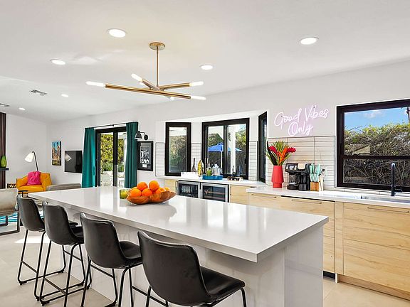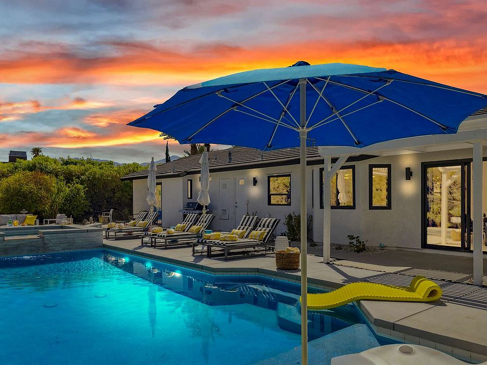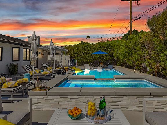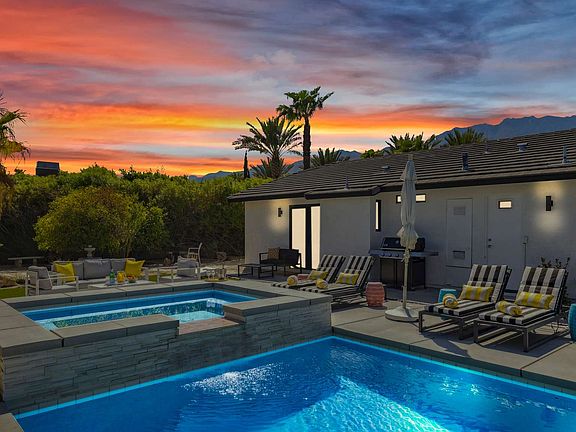 Step outside to your completely secluded, oversized backyard featuring a huge new saltwater pool, baja deck and 14-person spa; an 8-person outdoor dining area with infrared heat, Adirondack chairs surrounding a gas fire pit, cozy seating areas tucked into a succulent Japanese zen fruit tree garden, outdoor games and ample space to relax and enjoy the beautiful Palm Springs sunrises and sunsets.