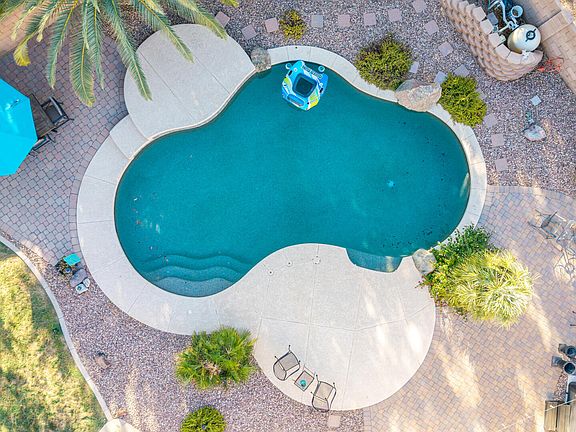 This spacious 5-bedroom, 3-bath home offers 3,751 sq ft on a ¼-acre lot backing to a peaceful common area with a view fence, no rear neighbors, and mature trees for shade. The entertainer's backyard features a sparkling pool and spa, sand firepit, basketball court, covered patio, side yard, and RV gate. Inside, the flexible floorplan includes a loft, multiple living areas, and a downstairs bedroom and bath ideal for guests or multi-gen living. The open kitchen flows into the family room and is accented by custom steel doors, granite counters, and abundant cabinetry. Updates include a new roof, updated A/C, fresh paint, and new flooring throughout. Washer, dryer, and refrigerator convey with a solid offer, and seller is willing to contribute to buyer's costs. Security system conveys.