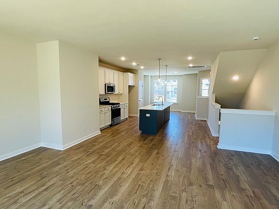 Stylish lvp flooringSpacious islandStainless steel appliancesOpen-concept living spaceGas rangeQuartz countertopsBackyard fire pit