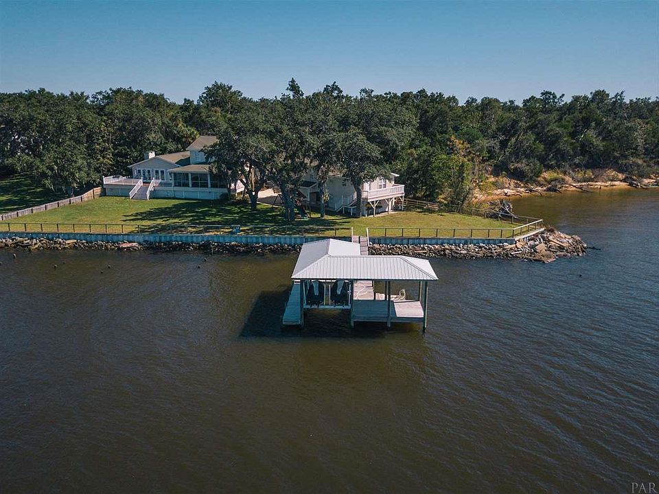 Nestled on Butcherpen Point and backing up to the Naval Like Oaks Reserve, this waterfront executive home offers spectacular privacy combined with immaculate views of Pensacola Bay. Enjoy the waterfront lifestyle with 241 ft. of waterfront and a newly constructed dock. As you walk into the open living area you will notice the neutral colors and flowing natural light entering the space. A modern sun filled kitchen is located directly off of the living area featuring ample storage, Five Star gas range, granite countertops and under cabinet lighting. A large island with seating includes a stainless Kitchenaid dishwasher. The dining area is along the wall of north facing windows and french doors that allow for sunlight to fill the room and a deck that is perfect for a morning espresso overlooking Pensacola Bay. An oversized family room is excellent for watching movies and entertaining with its wet bar. It also includes cabinets for extra storage and a workspace for a home office. The first floor private master suite includes breathtaking water views and direct deck access. The master bath includes a jetted tub, separate shower and double vanity. Additional oversized bedrooms feature full baths and sitting areas. A two car garage is combined with an upstairs apartment, apprx 1000 sq ft that's inclusive of mls listing sq ft, with stunning views overlooking Pensacola Bay. This space also features a complete kitchen, cathedral ceilings and a oversized bedroom. The whole family will enjoy hiking the trails of the Naval Live Oaks Reserve adjacent to the home. Desirable Reservation Rd. is home to many waterfront luxury homes. Minutes away from blue ribbon schools, parks, the Beach and Downtown Pensacola, do not miss this waterfront listing!