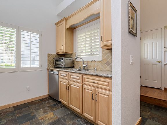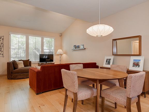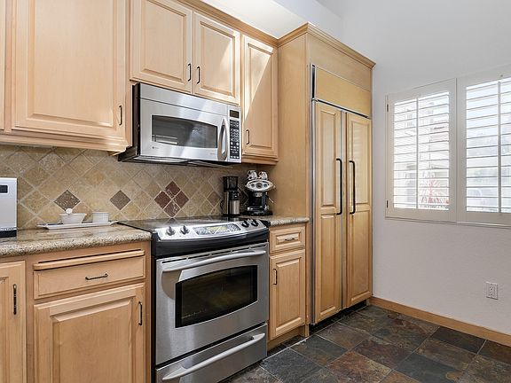 Rarely available, remodeled townhome end unit in desirable Elan complex. Formal entry w/ slate floors & soaring vaulted ceiling lead you to an inviting living room & dining area w/ high ceiling, solid hardwood floors, corner fireplace w/ slate tile surround & custom shutters. Open kitchen w/ granite counters, breakfast bar, stainless appliances, skylight, slate tile floor & ample cabinet space. Separate family rm / office w/ hardwood floors, custom shutters & sliding doors to a tranquil & very private backyard. Full size indoor washer & dryer. Half bath w/ wood floors & sleek euro style cabinets. Generous size guest bedrm w/ hardwood floors, shutters & ample closet space. guest bath w/ Shaker style cabinet & granite vanity top, tile floor & shower over tub. Master suite w/ vaulted ceiling, hardwood floors & double mirrored closets. Master bath w/ separate double vanity, heated tile floors, towel warmer, Shaker cabinets & granite counters. Attached garage, central AC & prime location.