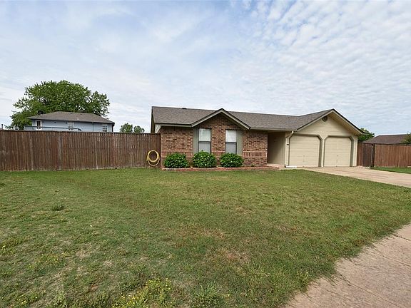 Check out this cute as can be 3 bedroom, 2 bathroom home in an excellent location! Home sits at the center of the cul-de-sac with a spacious yard. Step inside to the nice size living room with vaulted ceiling, light wood look laminate flooring, brick wood burning fireplace, with easy access to the kitchen/dining areas. Kitchen includes a gas stove/oven, dishwasher, stainless refrigerator and stainless double sink that overlooks the backyard. Laundry space is between the kitchen and 2 car garage that also has an in ground storm shelter. Washer and dryer, as well as the refrigerator are included! Dining area features French doors that lead outside to a charming covered patio and large fenced back yard. Primary bedroom has a private bathroom with a shower. Additional bedrooms are carpeted and on either side of the secondary bathroom that has a tub/shower. Home is about 2 miles from the University of Oklahoma and has quick access to Hwy 9. Easy to show! Grab your favorite Realtor and schedule a viewing today.
