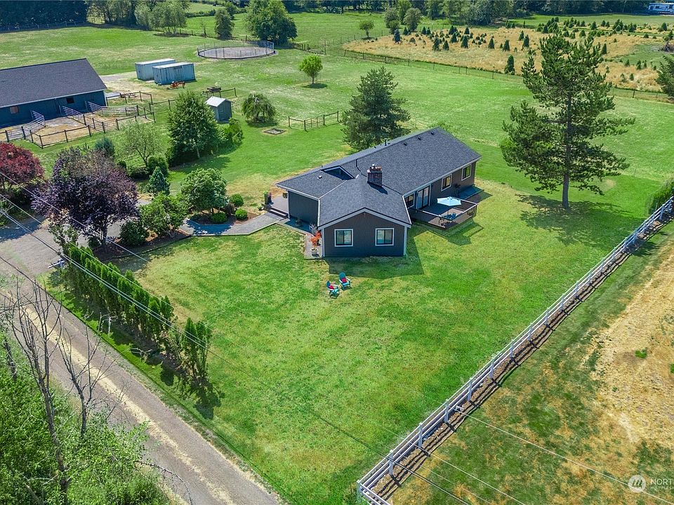 Beautifully remodeled view rambler on 5 acres in Historic Hobart. New roof, siding, trim, fixtures, appliances & much more! Vaulted cedar ceilings, exposed beams, custom fixtures, durable laminate hardwoods, formal & informal spaces. Cozy wood burning insert backed by floor to ceiling white washed brick. New Furnace and mini Splits. All new doors, trim & hardware. Spacious open kitchen, new cabinetry w/ soft close hinges, large chefs island, beautiful quartz countertops & backsplash. New quality Stainless appliances. Large primary w/ private ensuite & walk in closet. Good sized secondary rooms. Abundant storage. New Trex deck front & back. 30x60- 7 stall barn, Outdoor wash rack, 60' round pen, fruit trees, garden space & hay pastures.