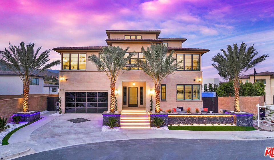 Unparalleled Luxury Living in Coveted Westcliffe at Porter Ranch. Welcome to a realm of opulence in this exquisite Summit Model Floor Plan Santi Elite home, boasting the largest footprint and nestled on a sprawling 13,000+ sqft corner lot within a highly sought-after cul-de-sac. Perched majestically, this residence offers panoramic vistas of majestic mountains, cityscapes, and rolling hillside terrain, creating an idyllic backdrop for every moment. Step into a world of resort-style indulgence as you're greeted by an oasis-like setting, featuring an expansive smart swimming pool equipped with cutting-edge saltwater technology, cascading water features, and a captivating water wall, complemented by a luxurious beach entry for ultimate relaxation. Adjacent, discover a detached spa entertaining area, meticulously crafted for year-round enjoyment, complete with lavish fire features, a custom-built free-standing TV wall for in-spa entertainment, and a grand fireplace flanked by two decorative fire pilasters, all overlooking the breathtaking hills of Porter Ranch. Every inch of this home has been thoughtfully designed and adorned with modern, sophisticated finishes, complemented by over 100 majestic trees enveloping the property, ensuring tranquility and privacy at every turn. Revel in the assurance of quality craftsmanship with a 10-year warranty from the esteemed luxury home builder Toll Brothers, alongside eco-conscious features such as a whole-home water softener and purification system, owned solar panels, and a smart-saving water irrigation system. Entertain with ease in the stylish built-in wet bar, ascend the stunning three-story floating staircase to discover a generous bonus entertaining room complete with a full bathroom and expansive outdoor terrace, or retreat to the private gym for a rejuvenating workout session. This home is a showcase of distinction, boasting over $500k worth of builder upgrades and structural options, ensuring a lifestyle of unparalleled sophistication and comfort. Embrace the convenience of three EV car charger stations, including two within the garage and one on the exterior, alongside upgraded expansive window systems and sliding glass doors that seamlessly merge indoor and outdoor living spaces. Experience the epitome of luxury living with this rare, brand-new turnkey opportunity in the prestigious Westcliffe at Porter Ranch community. Enjoy proximity to top-ranked public and private schools, including the acclaimed Porter Ranch Community School and Sierra Canyon Schools, ensuring the utmost in convenience and education excellence. Don't miss your chance to own a slice of paradise in one of Porter Ranch's most coveted enclaves. Schedule your private tour today and elevate your lifestyle to new heights.