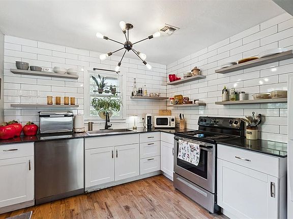 Floating shelvesSleek frameless glass doorWalk-in showerBeautiful original hardwood floorsGood-sized yardCrisp white subway tileUpdated kitchen