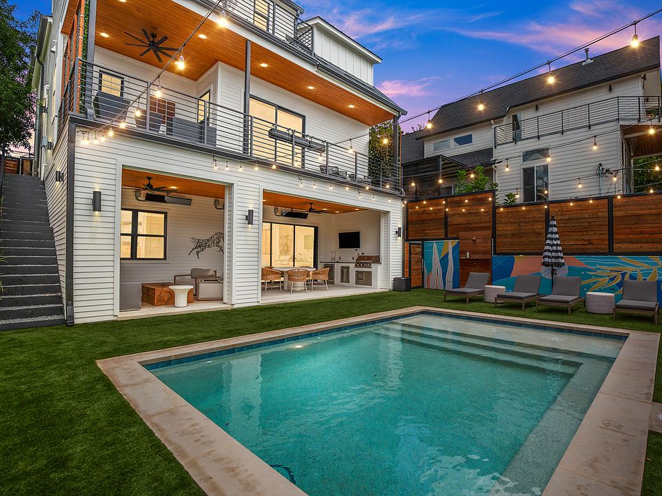 Brand new construction 4 bedroom 5 bath Office Salt water pool with outdoor shower Fully furnished including patio, bedding, tv and Sonos Garage Art and murals throughout Three level ac Washer and dryer Walk to many great restaurants on eastside