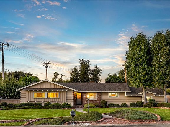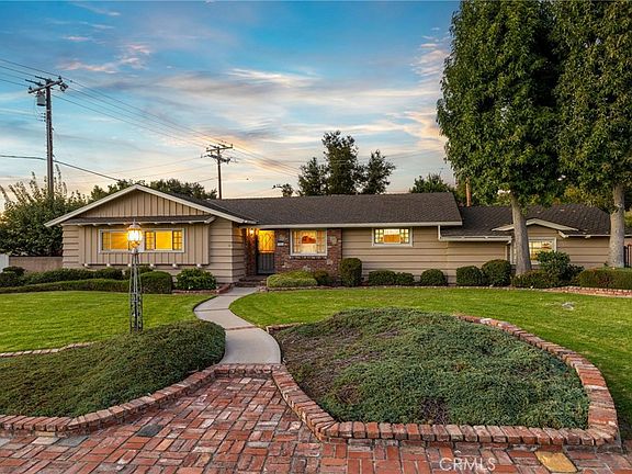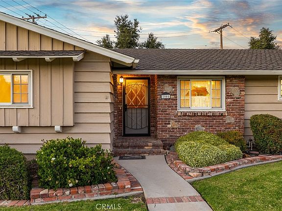 Single Story Home Situated on a Spanning Lot. This charming home features manicured landscape with a green lawn, brick perimeter planters, and a concrete walkway leading to a welcoming covered front brick porch. The front door opens to rich hardwood flooring leading you into a spacious living room with brand new carpet (throughout), a classic brick fireplace, and French Doors that open to the backyard. Adjacent to the entry is open kitchen offering wood cabinetry, tiled countertops, a kitchen sink that overlooks the front yard, offers a breakfast nook, and opens to the family room. The family room features hardwood flooring, rustic exposed beam ceilings, a built-in media center, and a dramatic floor-to-ceiling fireplace with a radius front. A sliding door leads to the back patio and the backyard invites the outdoors in. Down the hallway there's an abundance of storage cabinets leading to three bedrooms. The primary bedroom offers a wall of closets and built-ins, a ceiling fan, a window to the backyard, and an ensuite bathroom. The primary bathroom offers tiled floors, dual sinks with a vanity counter, and a shower/tub with a sliding glass enclosure. The two additional bedrooms are equally inviting, both with ceiling fans, hardwood floors. An additional hall bathroom serves these bedrooms. Last is a laundry room off the kitchen that also provides access to the backyard. The gated driveway pulls all the way through to the rear-facing two-car attached garage and a covered carport for extra parking. The backyard offers a grass area, a brick perimeter lined with mature trees and bushes, and a covered patio with concrete decking, perfect for relaxation or entertaining.