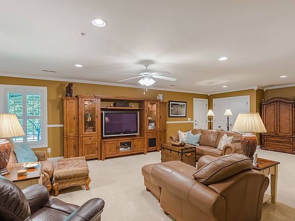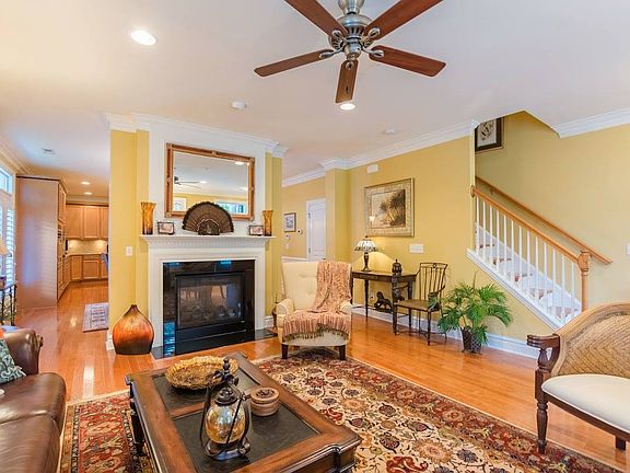 ground floor of this elegant END-UNIT townhome you are met with a 3 car garage (painted floor) at the back end and a furnished recreation room with an attached covered porch on the front and side. The gourmet kitchen is equipped with state of the art stainless appliances including double ovens, a gas cook top, microwave and refrigerator. A large kitchen island, Silestone countertops, tile back splash, beautiful 42'' maple cabinetry, satin nickel hardware and attractive recessed lighting complete the kitchen. The owners have added a built in wine rack to the cabinetry. The main level also boasts 9'ceilings, crown molding, hardwood floors, a dining room with chair rail and picture frame molding,