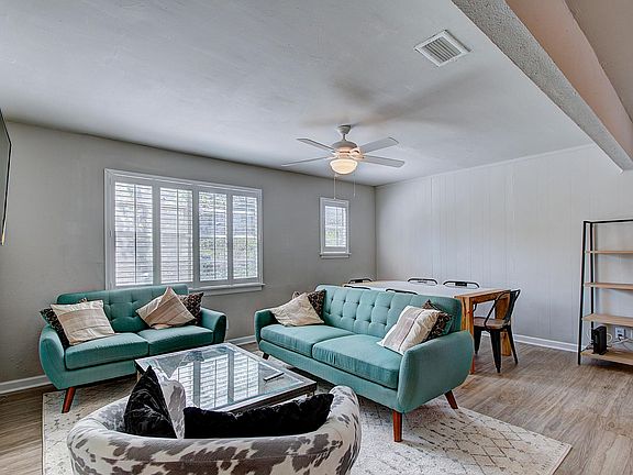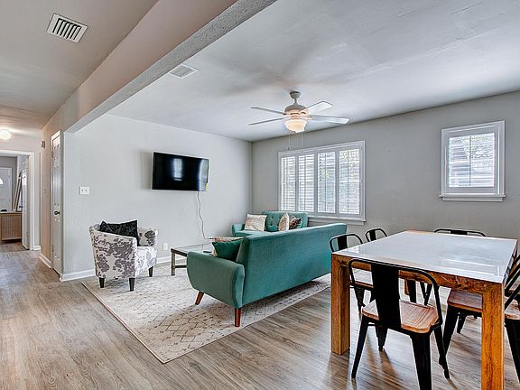 Fully furnished home with private patio and yard. Dog friendly. It is the B unit of a duplex but with no shared walls. One carport space plus driveway parking. Private washer/dryer located in carport. King bed in master, queen in second bedroom, third bedroom has a day bed with pull out trundle. Could easily be turned into an office. Owner pays for all utilities, no pet fees.