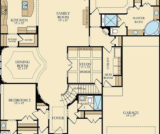 The marvelous two-story Preston plan by Village Builders features a study with the option to add beautiful built-ins, formal dining room, butler's pantry, a family room with corner fireplace and the option for additional built-ins, island kitchen with breakfast nook, mud room and large utility room, covered rear patio, master suite with en suite bathroom and a spacious walk-in closet, and a second-floor game room with the option to add a dedicated media room. The Preston floor plan also include the options to add an extended rear patio and outdoor grilling area.