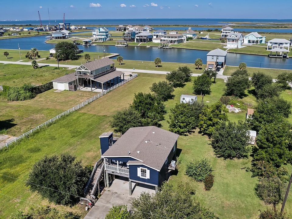 Bayside retreat with Galveston Bay and canal views. 2 mi to Bolivar Ferry. Built 2011 and updated with fresh paint and wood-look vinyl plank flooring throughout. Kitchen features quartz countertops, designer tile backsplash, farmhouse sink, and decorative vent hood. Bathroom includes textured tile and a spacious walk-in shower. Open-concept living area with natural light and neutral finishes. Deck offers water views of Galveston Bay, intracoastal waterway, and nearby canals—ideal for enjoying sunset scenes. Situated on a 0.32-acre lot in a quiet bayside neighborhood with easy access to beaches, parks, and ferry to Galveston Island. Includes space for boat parking and outdoor storage options. Covered parking below with room for golf cart or outdoor gear. Perfect primary home, coastal getaway or short-term rental opportunity.