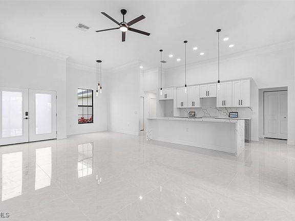 The kitchen offers a large granite island, contemporary cabinetry, and stainless steel appliances — perfect for cooking and casual dining at the breakfast bar. The master bedroom includes two walk-in closets, direct access to the lanai, and an ensuite bathroom with dual sinks and a spacious walk-in shower.