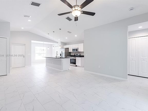 Welcome to this beautifully newly built 3-bedroom, 2-bath home in Lehigh Acres. Step inside to an open-concept living area filled with natural light, where 10-foot vaulted ceilings and elegant porcelain tile flooring set the tone for modern comfort. The kitchen is a chef’s dream, featuring granite counters, a large center island, stainless steel appliances and plenty of storage. Outside, a generous covered patio invites you to relax or entertain, while the quiet cul-de-sac location offers added privacy and peace. Moments from shopping, dining and schools, this home effortlessly blends style and convenience — a perfect place to make your next chapter. Inquiry about potential seller financing.