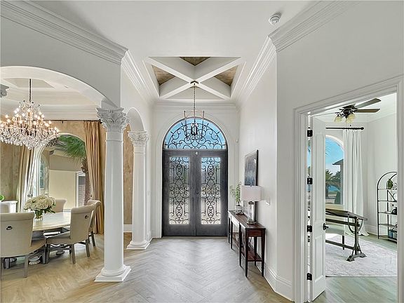 As you approach this stunning home, you'll be greeted by majestic Cantera wrought iron front entry doors revealing a grand foyer adorned with coffered ceilings. Entertain in style in the elegant dining room, showcasing 14-foot coffered ceilings and the adjoining spacious living room with its spectacular waterfront views, 24-foot cathedral ceiling w/chandelier lift, custom built-ins, and opulent triple crown molding. *