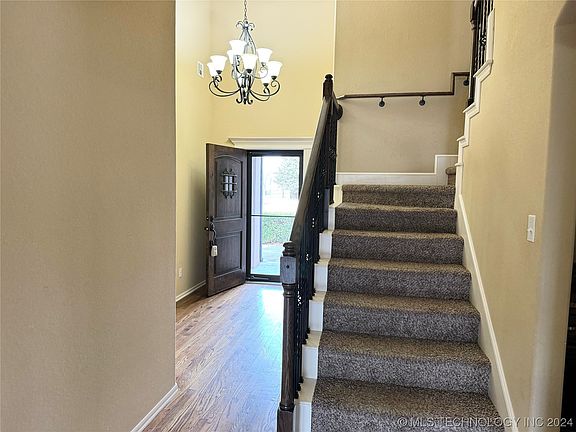This unique Semi-Open + Split floor plan features designer kitchen with stainless steel Gas appliances and breakfast nook + bar seating opening to vaulted living room centered around the Gas burning fireplace for those cold nights ahead! Secluded off the main living you will find the Primary suite with patio access, tiered ceiling, luxe private bath, Soaking Tub, Double Sinks & Separate shower, AND - the Dream Closet - with custom built ins, opening to laundry room with folding area. Second bedroom, + formal dining room or home office, and 2 full baths down; 2 bedrooms (one was being used as a home theater room) + game room with wetbar, + bonus/hobby room and 3rd full bath up. All bathrooms have double sinks! Security system installed. Ample storage throughout and floored attic space just in case. Saferoom is located in the side entry garage, which features a 3 car capacity, power lift doors, and a small work area. Convenient to Entertainment incl. Warren Theater, Parks, Bowling, Golf Sports Complexes, plus Tons of Dining (Starbucks, High end, & Quick Eats!), Shopping attractions, as well as Urgent Care and Large Hospital Systems. Just minutes to Turnpike and Multiple Highways allowing easy access for commuters to Tulsa and Surrounding. Quick close possible!