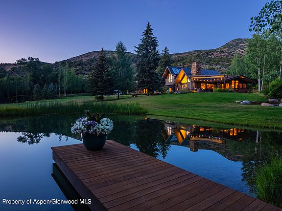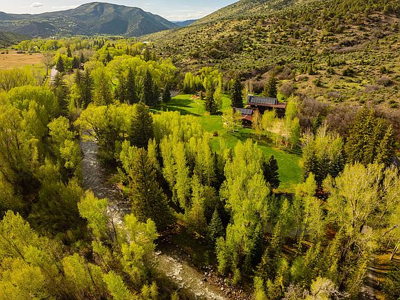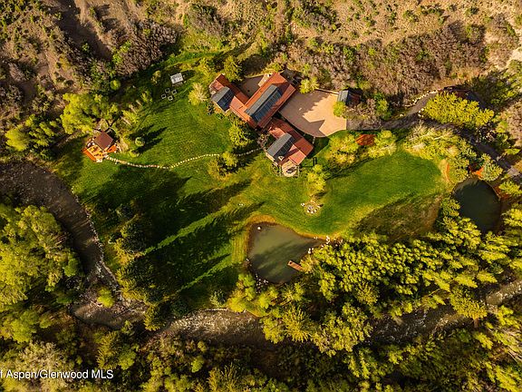 Rio Zeta Ranch is a magnificent riverfront estate with mountain views nestled at the bottom of Watson Divide alongside Snowmass Creek. With an unparalleled blend of luxury and natural beauty, this property is comprised of a custom-built modern home, quintessential guest house, freestanding Pilates studio and creek side entertaining pavilion with outdoor kitchen. Set on over 800 ft. of pristine shoreline, this one-of-kind property boasts two ponds, one with aeration for fishing and one with dock for summer and winter recreation, a private bridge over Snowmass Creek, multiple outdoor living areas, a year-round greenhouse and meticulous landscaping and gardens throughout. The architectural design of the residence harmoniously invites the outdoors into nearly every room, creating synergy between the interior and the surrounding landscapes. The gracious 7110 sq. ft. home includes an exquisite, main floor primary suite that walks out to the gracious lawn, three large en-suite bedrooms, two featuring private outdoor terraces with breathtaking views, as well as a media room, billiards room, and a wine room, perfect for entertaining friends and family. Private and serene yet only 20 minutes from Aspen and Snowmass Village, this magical setting offers a rare opportunity to own an impeccably designed home with incomparable amenities in an idyllic mountain setting. A true river oasis!