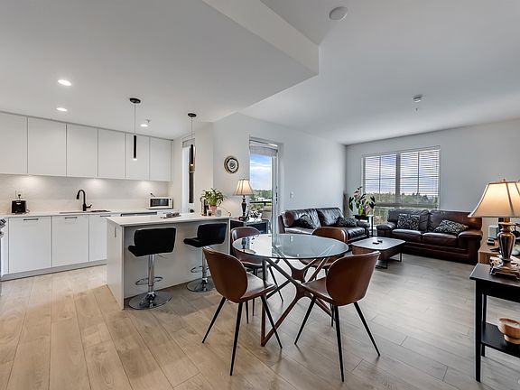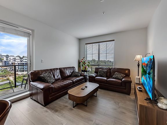 Welcome to this beautifully designed corner unit featuring 3 bedrooms, 2 bathrooms, and a den with a custom home office. The open-concept kitchen includes stainless steel appliances, a gas range, island with quartz countertops, and laminate flooring throughout. Enjoy a spacious primary suite with walk-in closet and a luxurious ensuite. Additional features include custom cabinetry, 3 balconies, and 3 side-by-side parking spots next to the elevator with a storage room next to it. Located in the vibrant Latimer Village-steps from cafes, restaurants, parks, schools, Willowbrook Mall, Costco and Hwy 1. Showing by appointment.
