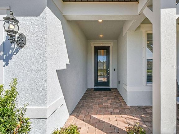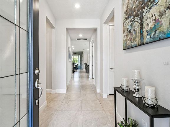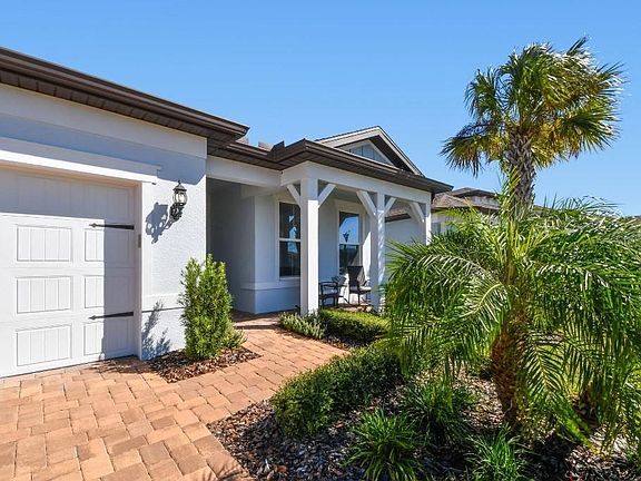 Welcome to care-free resort-style living located in the upscale gated 55+ community of Del Webb Bexley. This popular upgraded Mystique model offers 2-Bedrooms, 2-Bathrooms, additional flex/den room with French doors, oversized 2 1/2-car garage with a 10x15 tandem space area for extra storage or golf cart plus extended covered and screened lanai. Arrive to manicured HOA-maintained landscaping, a brick paver driveway and welcoming 14’ x 6’ covered porch. Step through accessible entry way with decorative glass front door. Luxury ceramic flooring runs throughout the entire house, spacious hallways and wide doorways make this home fully accessible and stylish. At the heart of the home is the Chef’s kitchen with quartz countertops, upgraded 42-inch cabinetry, beautiful hood range, and extended island with end cap cabinets for additional storage. You’ll love the convenience of pull-out shelving, large drawer stack, soft-close doors and drawers and under-cabinet lighting. The kitchen also features large granite sink, a walk-in pantry plus Whirlpool stainless appliances including 5-burner gas cooktop, wall ovens, and dishwasher. The Frigidaire refrigerator is also included. The open dining area – complete with ceiling fan on dimmer – flows seamlessly to the extended screened lanai. Designed for easy entertainment, the lanai is pre-plumbed for an outdoor kitchen with a gas line ready for your grill. It even includes a kitchen cabinet, bar refrigerator and wiring for outdoor wall TV including universal TV mount. The spacious primary bedroom is located towards the back of the home, to ensure privacy. It includes a luxurious en-suite with dual sinks, quartz countertops, and fully accessible extended walk-in shower with built-in bench and grab bars. A separate water closet with grab bar, linen closet, and large walk-in closet complete this luxurious suite. The laundry room has custom cabinets with a laundry sink and quartz countertops plus additional storage space in the adjacent A/C room. The second bathroom is located right outside the front bedroom, featuring a tile shower/tub combo and quartz countertop. Additional upgrades include surround sound pre-wire with ceiling speakers in the great room and lanai. All windows pre-wired for motorized shades, Tankless water heater, Westinghouse whole house water purifier system, extra outlets in the garage plus coated garage floor, ceiling fans in all rooms, Synergy Security System, which monitors front doorbell, garage door, all windows and entry ways, motion detection and an app to control HVAC. Del Webb offers the Fabulous Florida Lifestyle with active social community and amenities center including Resort-Style Pool, Resistance Pool, Hot Tub, and Cabanas, Expansive 19,000 sq. ft. Clubhouse, Fitness Center, Cafe/Bistro, Pickle Ball & Tennis Courts, Dog Park, and Social Clubs/Groups. Located close to shopping, restaurants, entertainment, medical facilities, FL-54 & FL-589(Suncoast), you’ll have an easy commute to Downtown Tampa and Tampa International Airport. This home will not disappoint you. Call to schedule your private showing today!!