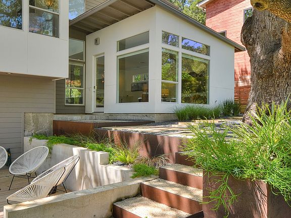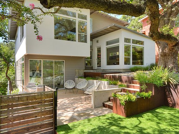 Travis Heights modern tree house situated on a corner lot and updated to perfection. Exceptional natural light throughout. Modern unique finishes include polished concrete, cork & wood floors, stone counter-tops & desirable chef's kitchen. Abundance of storage throughout with large custom closets finished out for optimal organization. Multi-level floor plan ideal for a variety of home buyers and takes full advantage of the lot and space. Spectacular front yard entertainment space and two-car garage.