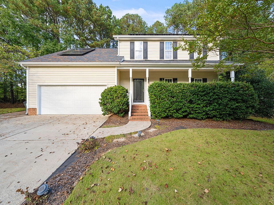 Welcome to this 4 bedroom, 2.5 bath home ideally positioned on a quiet cul-de-sac, offering easy access to historic Downtown Apex, RTP, Raleigh, Durham, and more. The first floor features gleaming hardwoods and a fully renovated kitchen with maple cabinetry, quartz countertops, tile backsplash, stainless steel appliances, and custom shelving. French doors open to a spacious, fenced backyard designed for entertaining—complete with an oversized deck, pergola with outdoor fans, a paver patio, and a storage shed. Upstairs, you'll find four comfortable bedrooms, including a generous primary suite. Major updates provide peace of mind, including a newer roof (2023), newer solar panels, a tankless water heater, a dehumidifier in the crawlspace (2020), and HVAC (downstairs 2020, upstairs 2024). This home blends modern upgrades with outdoor living and a convenient location—ready for its next chapter.