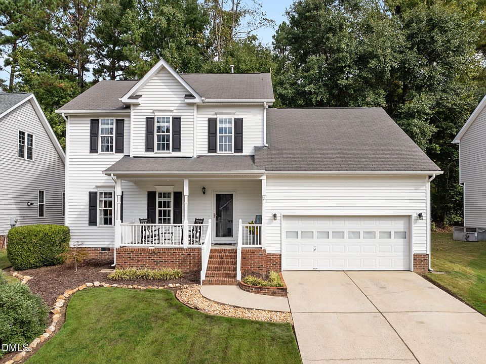 Welcome Home! This 2,116 sq. ft. home on a .17-acre lot offers 4 bedrooms, 2.5 bathrooms, and a layout designed for comfort and function. Hardwood floors extend throughout the main level, where you'll find a formal living room, dining room, and an open-concept family room with a cozy gas fireplace. The kitchen features granite countertops, stainless steel appliances, and a stylish glass tile backsplash. Upstairs, the primary suite impresses with vaulted ceilings and a recently renovated bath. Three additional bedrooms are full of character, natural light, and storage, sharing a renovated bath with new tile flooring, vanity, faucets, and mirror. All bedrooms feature hardwood floors. Recent updates include fresh interior paint, a pre-home inspection with minor repairs completed, and a 2-car garage with built-in storage systems. Outdoor living is equally inviting with a welcoming front porch and a private fenced backyard with deck and patio. Community amenities include a pool, and the location can't be beat, close to I-540 for quick access across the Triangle, Jordan Lake, Apex Nature Park, and abundant shopping and dining. Move-in ready with updates already complete!