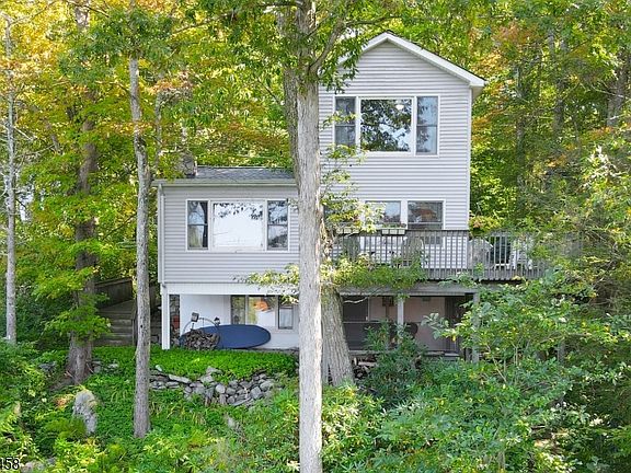 Located on the southeast shore of 350-acre Highland Lake, this classic three-level, 3BR/2BA lakefront offers 65' of shoreline, a private dock, and long water views. The light-filled living space features wood floors, cathedral ceilings and a fieldstone fireplace. The adjacent dining area and bright kitchen lead directly to a wide lake-view deck ideal for coffee at sunrise and dinners at dusk. Two bedrooms share the entry level. The entire second floor includes a private primary suite with full bath, generous closet and lake vistas. The walkout lower level extends the living space with a flexible bonus room warmed by a wood stove, plus storage, laundry, and utilities. Step out to an attached screened room for weather protected outdoor enjoyment. Features include: NEW September 2025 roof, 2002 addition/renovation created the second-floor primary suite and refreshed the kitchen; a 1,000-gal concrete septic with dual 500-gal seepage pits rated for 2 bedrooms (2001) and a 200' deep well. Originally built in 1950, the property blends timeless character with modern comforts. Enjoy Highland Lakes' five pristine lakes, seven guarded beaches, and a bustling clubhouse scene sailing, tennis, bocce, swimming, and more. Winter sports are just a short drive away at Mountain Creek. A welcoming waterfront retreat, ready for its next chapter.