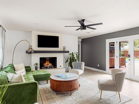 Sparkling poolStriking fireplaceExpansive deckingTurf lawnResort-style escapeOversized lotSpa-like ensuite bath