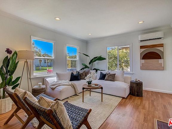 Crisp and bright, upgraded gem filled with natural light & ease of living welcomes you home! Upon entry you'll note a sunny living room with a decorative fireplace, built-in open shelving, crown moldings and recessed ceiling lights. A gourmet eat-in kitchen features quartz countertops, tile backsplash and is equipped with Frigidaire stainless steel appliances and french door Maytag refrigerator w/ water & ice dispenser. Enjoy the modern conveniences of updated bathrooms, dual paned windows and interior laundry hookups! Generous front facing bedroom with a bay window overlooks the flowering tree in the grassy yard. Set towards the back, the spacious Primary bedroom has adjoining bath and direct access to the backyard. Additional guest bedroom and a full guest bath are off the hallway. Home has been recently repainted in white and has beautiful original hardwood flooring in the living areas and new Spanish tile in the bathrooms. Charming detached Guest House, complete with its own kitchenette & full bath is ideal for your guest visits or work from home needs. Ample backyard with lush landscape welcomes all year around. Convenient location nestled in cul-de-sac between Culver City Arts District and Picfair Village. Easy access to I-10, close to great shops, restaurants and more!