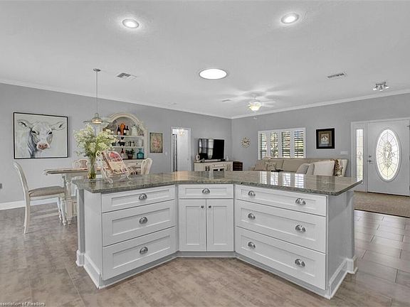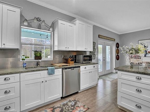 AMAZING Pool Home on nearly 5 acres. Lots of privacy here. Awesome covered front porch complete with porch swing. The house is stunning & features NEW porcelain plank tile throughout. Solid surface island kitchen with white multi-level Shaker Style cabinets, stainless steel appliances, & stainless backsplash. Awesome kitchen to meal prep or entertain in and still be a part of the conversation. Unobstructed open concept, split floor plan with crown molding throughout. Kitchen, Dining and Living room are all open and one big great room. Plantation shutters on the large living room window add cozy character! The luxurious resort style master suite is a wing all in its self. Wake up every day as if you are on vacation! Large master bedroom with huge walk-in closet built out w/ closet system. The Private master on-suite is breathtaking with vintage dresser vanity and glass block shower. Both the Master bedroom and dining room have french doors that lead to the covered lanai & caged pool. 2 additional bedrooms and full bath with extensive decorative mosaic tiled shower on the opposite side of the house. Large indoor laundry with new front load washer and dryer, wash sink and lots of cabinets for additional storage options. Attached 2 car side entry garage. Gorgeous inground caged pool w/ fountain & outdoor shower., and pool storage room. And check this out: The master bedroom closet and the lanai have doggie doors leading to vinyl fenced 60x50 side yard. This space is perfect for pets and kids to play outdoors safely.