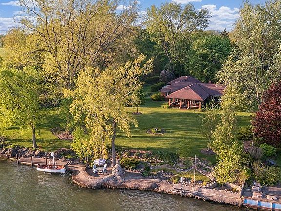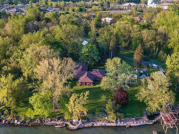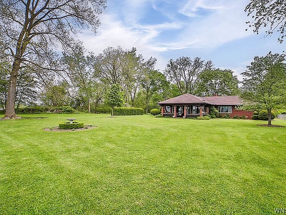 Secluded parklike setting for this elegant waterfront 3 BR 2.5 bath brick ranch. This homes features custom quality updates & is located on the Niagara River w/panoramic water views, 2 decks w/hoists & unique custom patio w/fireplace at river. Welcoming foyer w/slate flooring. Gourmet kitchen features Cherry soft close cabinetry, built-in Thermador fridge & freezer, Wolf dual fuel range, granite counters, island, Limestone flooring, lighted tray ceiling, microwave drawer, warming drawer, built-in circular seating w/table surrounded by windows. LR & DR have Acacia hardwood flooring & crown molding. LR has stone fireplace & built-in bookcases. DR has center dome w/Austrian crystal chandelier. FR has heated flooring, coffered ceiling & wet bar w/Red Dragon granite countertop. Cozy covered patio has fireplace, Viking grill & sink. Primary suite with two walk-in closets & full bath w/slate shower & vanity w/Corian counter. Greenhouse w/water. 24 x 28 out building w/220. Attached garage w/water & center drain. 1st floor laundry w/built-in ironing board & utility sink. Cedar closet. Pull down stairs to attic. Covered side patio. Lush grounds! Sq Ft adjusted due to FR. O/D 5/22 at 4