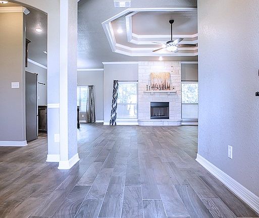 Step inside to discover the epitome of elegance and comfort. The interior features wood look tile floors throughout the formal dining room, great room, and kitchen, creating a seamless flow and a touch of warmth. The great room is the heart of the home, boasting a double tray ceiling with crown molding accents and a striking white stone fireplace, perfect for cozy gatherings or quiet evenings in.