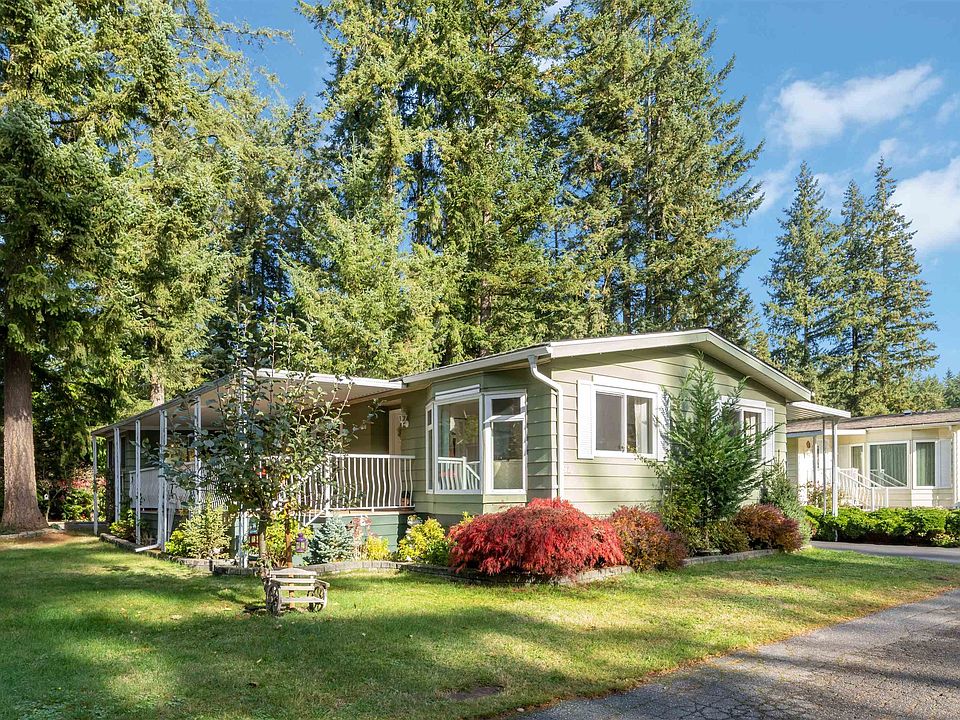 This spacious double-wide home is move-in ready and perfectly situated in a great location in the park. Features include a new roof, vaulted ceilings, updated plumbing, kitchen and bathroom with walk in shower. Nestled among mature trees, it offers a peaceful setting with two covered decks for year-round BBQs, entertaining and also has covered parking. There's loads of space for your gardening desires, two large sheds for storage or create a workshop. The bonus room off the deck has its own entrance and could be a studio, or hobby space. Enjoy the community clubhouse & welcoming neighbours in this well-run community. RV parking available, and walking distance to IGA, The Artful Dodger Pub, and other local amenities. 55+ community and sorry no pets allowed.