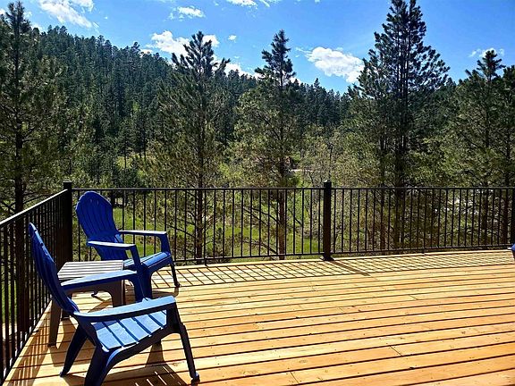 For more information, please contact listing agent Michael Warwick 605-641-2569 with Great Peaks Realty. Black Hills Hidden Gem! Welcome to Higgins Gulch, a serene subdivision nestled west of Spearfish. Perched amidst the hills, yet only a short 10-minute drive from town, this location offers the best of both worlds. During construction, the seller discovered a spring, blessing them with their very own pond - with cascading waterfall. This home boasts a spacious kitchen & dining area with incredible views! Gas fireplace adds warmth & charm, dividing the kitchen from the living room. Step out onto the expansive deck, where you can soak in the majestic scenery, plus a covered deck facing south. The primary bedroom features a luxurious tile shower, with a private deck overlooking the spring-fed pond and enchanting waterfall. Convenience is key w/ main floor laundry, while the walkout basement offers 3 bedrooms, another laundry area & convenient kitchenette. High ceilings & large windows throughout the house flood this space with natural light. For ultimate relaxation, indulge in the hot tub offering panoramic views. Nature enthusiasts will appreciate the property's natural spring fed pond, complete with a striking 100-foot-long 14-foot-high rock wall. Need easy access? An elevator awaits to whisk you to the elevated main level effortlessly!! Seller has utilized this property as a VRBO.