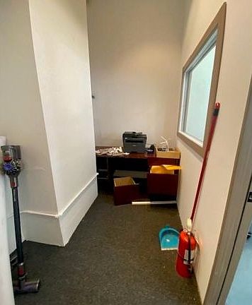 Separate office roomHalf a bathroomModern high-hat lightsNew carpetingLarge window display