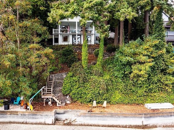 On Puget Sound, enjoy 75 ft of waterfront with this charming cottage-style home that welcomes you with a beautifully landscaped courtyard and cedar-lined covered entry. Step inside to stylish wood-look flooring that leads to a sunlit great room, where expansive windows frame peaceful bay views. The open kitchen and dining area are ideal for gatherings, seamlessly flowing to a spacious covered deck through elegant French doors, perfect for indoor-outdoor entertaining. Main floor offers an ensuite with three-quarter bath, while the lower level provides a comfortable secondary bedroom, an additional bath, and primary suite with breathtaking bay views, and direct access to the patio, backyard, and steps leading to a private bulkhead and beach!