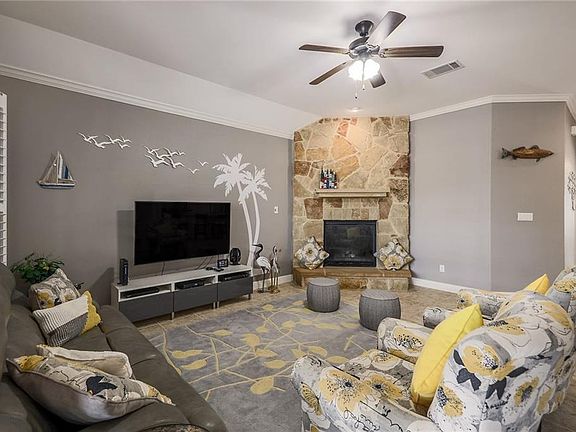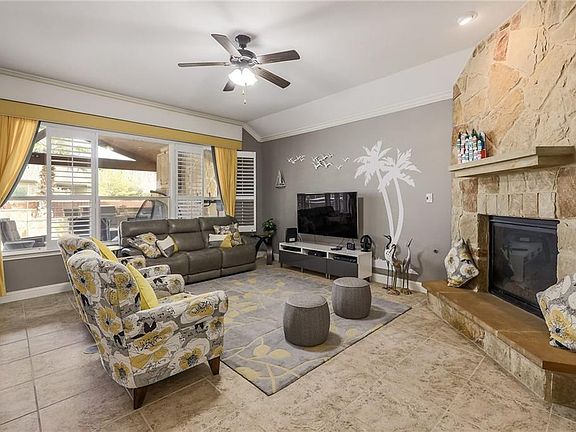 Listen to the serene sound of water fall while you taste all the bbq cooking from a true outdoor kitchen. Warm up from 2 fireplaces or gaze at the stars from the hot tub (conveys). Open concept where owners are separated from secondary bedrooms. Spacious kitchen ready for the tasteful foods while everyone congregates in the circular granite island. Open floorplan, airy gorgeous white shutters complimenting big windows, tall ceilings, detailed coffer ceiling. Beautiful home where paradise awaits you!
