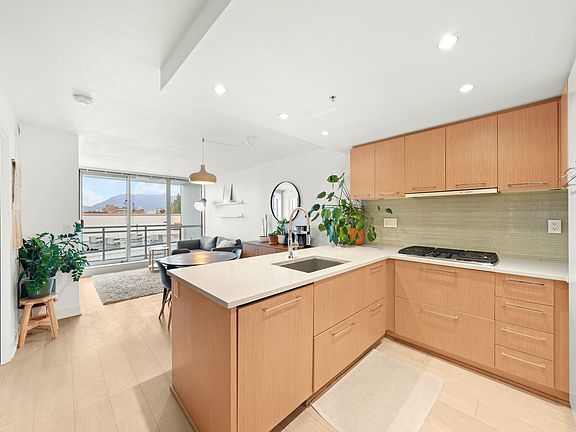 Welcome to Mantra, built by Cressey! This 673 sq ft. Sub-Penthouse 1 bed+1 bath boasts exceptional features, with a special highlight on its exquisite millwork and expansive kitchen cabinetry. The award-winning "Cressey Kitchen" is a standout, showcasing a gas cooktop, built-in microwave and oven, sleek quartz countertops, a wine cooler, and abundant cabinetry for unmatched storage and style. Custom millwork throughout elevates the home’s sophistication, adding elegance to every space. Enjoy floor-to-ceiling windows with breathtaking mountain and city views from the spacious living room, a functional den, a solarium, and a BBQ-ready patio. This concrete-constructed home also includes geothermal heating and cooling in the condo fees! Complete with 1 parking and 1 locker.
