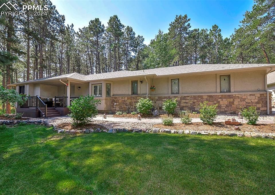 Stunning Stucco and Stone Rancher with Detached Garage/Workshop and Gorgeous Outdoor Living Space on a Wooded Acre in Desirable Woodmoor Golf Community! Set privately on a flag lot, a stamped concrete pathway leads to the front Trex deck with built in planter. Welcoming 12 x 10 foyer with hardwoods that extend throughout the main level. French doors off entry with transom window above that lead to the main level office with bay window and tray ceiling, or cruise ahead to the living room with gas fireplace and plantation shutters that open to nature in every direction! There is a built in dining table with strip lighting and granite counter that seats 8, w/TV and mount. Kitchen has island with more counter seating, beverage station with wine fridge, pantry, stainless appliances including gas stove and double oven, glass tile back splash, and walkout to fantastic stamped concrete patio with built in stone firepit and bar area. Serene Main Level Master with his-n-hers walk in closets and alluring 5-piece bath with stand alone tub and walk-in shower, double vanity with large framed mirror/cabinets & Quartz Counters. Powder room off kitchen and mud/laundry room w/washer/dryer, that has custom wood folding table, utility sink & built-ins off heated two car garage. NEW flooring on Lower level which has 11x9 landing area for desks or seating, newly painted family/music room with 5/8" sheet rock & insulation, THREE more newly painted bedrooms, full bath with granite counters, and built-in shelves in hallway that pulls out to reveal hidden storage space. Detached heated garage/workshop has epoxy flooring, water and gas line run to it, peg board and built-in cabinets as well as attic storage. Enormous Backyard has gardening area, horse shoe pit, reinforced invisible fence, and 3 motion cameras. Most main level windows are NEW, Insta hot water throughout! Home recently taken off the market due to minor water damage. Insurance covered lower level repairs and new flooring!