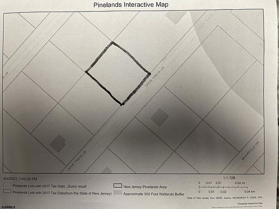 GREAT PRICE FOR A BUILDING LOT. Deer Track Lane was created via an official subdivision and the subdivision map is recorded at the Atlantic County Clerk's Office. A copy of the map as it appears in the Clerk's records is attached. The lot is identified by an "X" on the map. The street name, Block# and Lot# has been revised by ordinance and the revised name and numbers appear (2009 Deer Track Lane, BL 55, Lot 7) on the attachments. 1. Pineland's Interactive Map (1) - Lot is the rectangle and no part of the lot has dark gray wetlands and light gray buffers coverage. 2. Pinelands Interactive Map (2) - The area has been enlarged showing more of the development. No part of the lot has wetlands or buffers coverage. 3. Street Map - From Township of Hamilton showing Deer Track Lane is a solid red line that indicates the street is paved. 4. Hamilton Township Zoning Code qualifying a less than 1 ACRE PINELANDS LOT FOR A ZONING PERMIT. Will need Pinelands Credit to build.