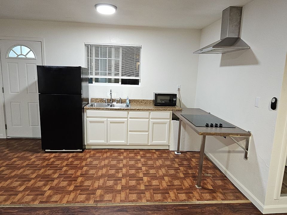 Freshly painted detached private studio. 200 sq.ft bedroom, 400 sq.ft living quarters consisting of a full bath(shower not tub), kitchenette with electric cooktop and exhaust hood, microwave, sink, and refrigerator. Unit has a dedicated water heater, 350 sq.ft private patio, parking for 2 vehicles in the driveway and street parking is available. All utilities are included in monthly rent, internet as well. Washer/dryer access negotiable. Pets negotiable.