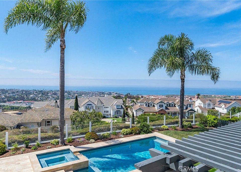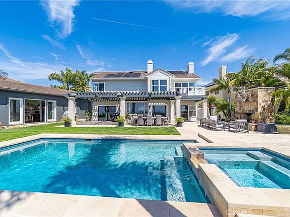 This light-filled home is set on a premier San Clemente terrace, with sweeping 180-degree ocean, Catalina, and city light views in a refined coastal setting. This private enclave is a thoughtfully designed 4409 sq ft estate, featuring 5+ bedrooms and 6 bathrooms. A Dakota stone pathway leads past Cypress and a majestic olive tree, setting the tone of timeless European influences with quintessential Southern California style. Inside, a voluminous entryway with Versailles-pattern limestone and custom ironwork handrail, leads to vaulted ceilings, carved stone fireplaces, and generous living spaces with seamless indoor-outdoor flow. The sunny attached casita, with ADU possibilities, has a private entrance, full bath, and temperature-controlled wine room that is ideal for guests, creative use, wine pairing, or a wellness studio. The panoramic ocean views are on full display from most every room.
